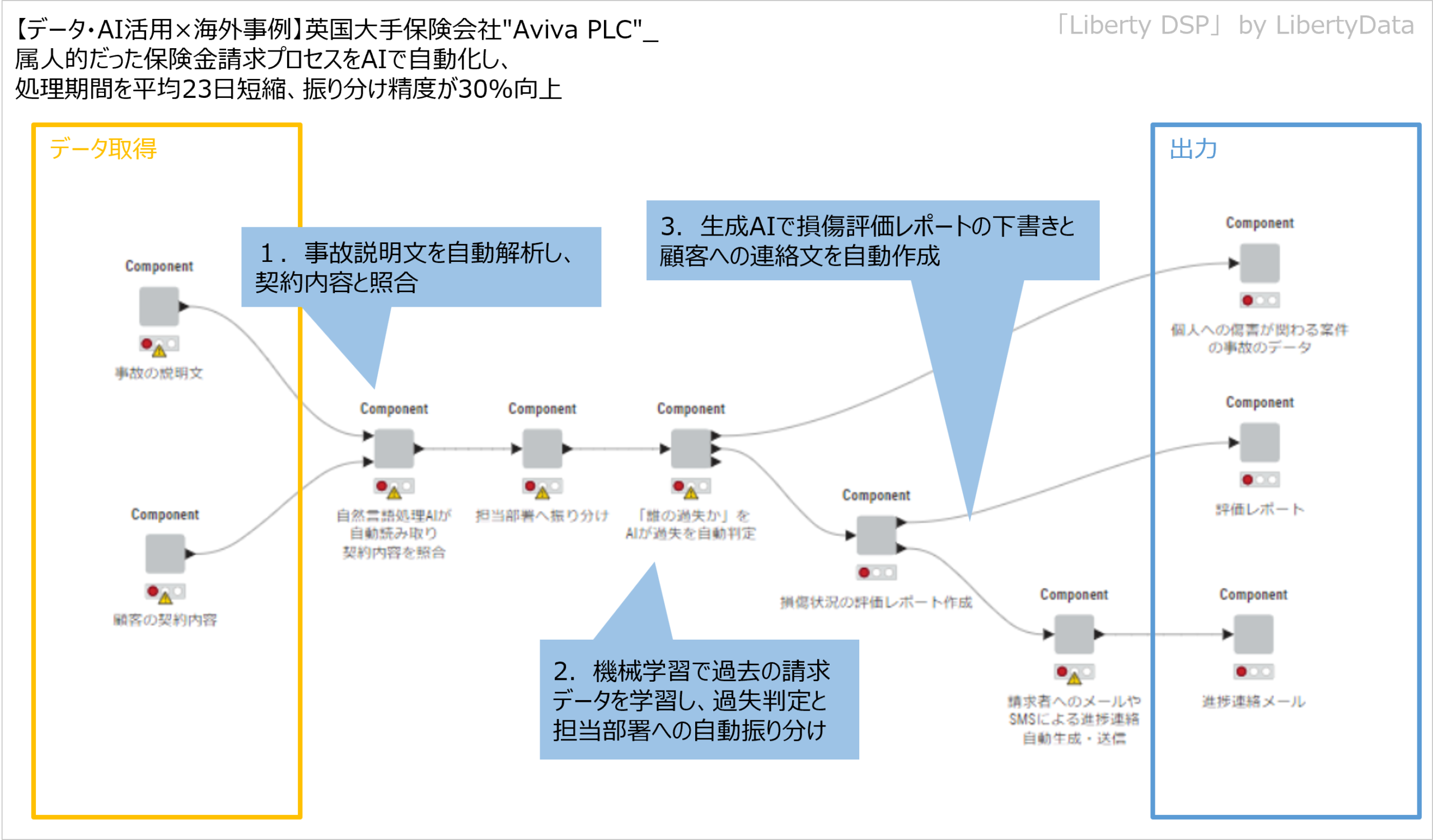 - 課題: 英国最大の総合保険会社”AvivaAviva PLC”では、保険金請求の処理は事故ごとに状況が異なるため判断が複雑で、担当者が手作業で対応するには限界があり、処理の遅れやミスが生じていたが、業界全体でのAI活用が遅れていた